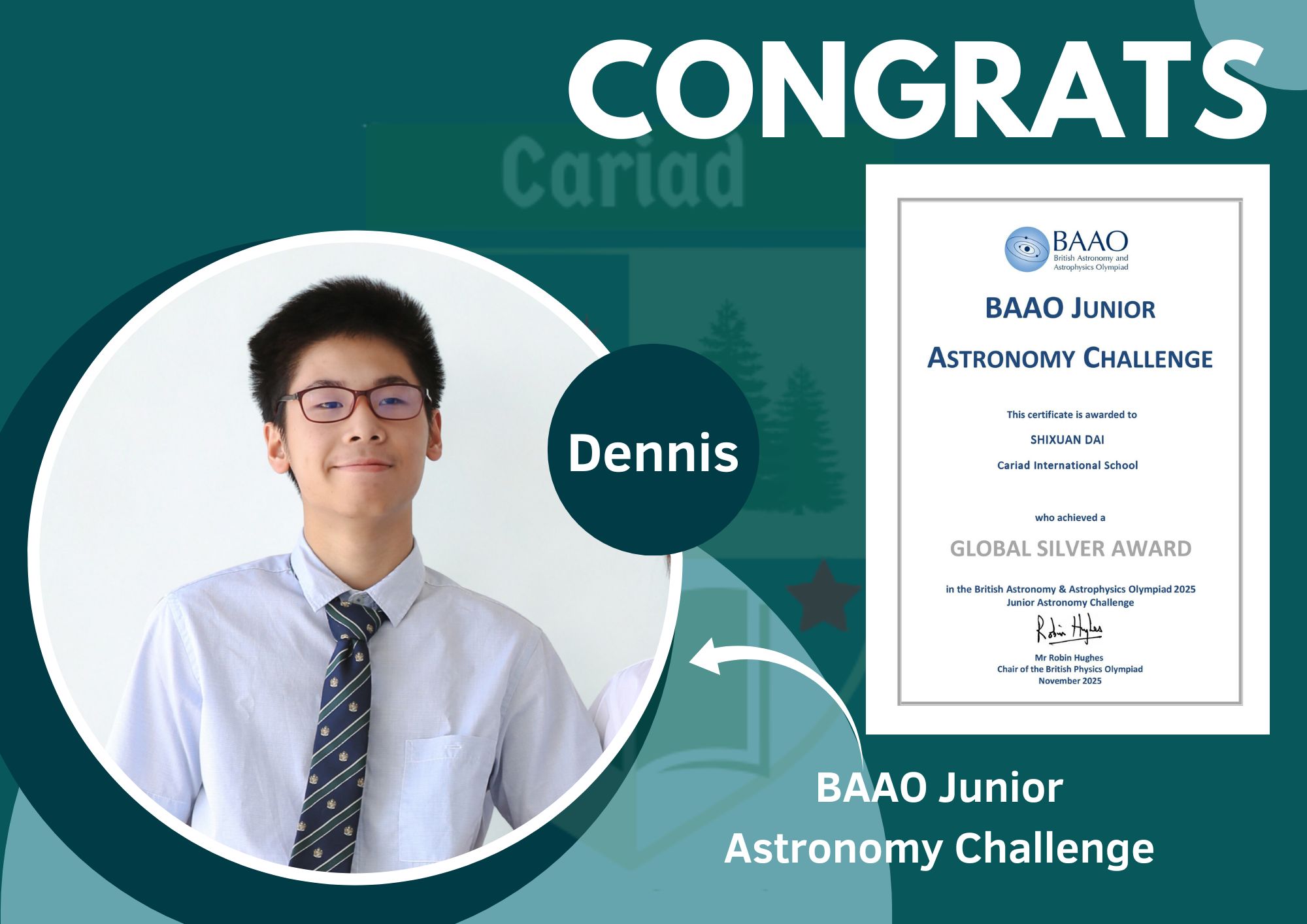 We are delighted to congratulate Dennis on winning a Silver Award in the British Astronomy and Astrophysics Olympiad (BAAO).