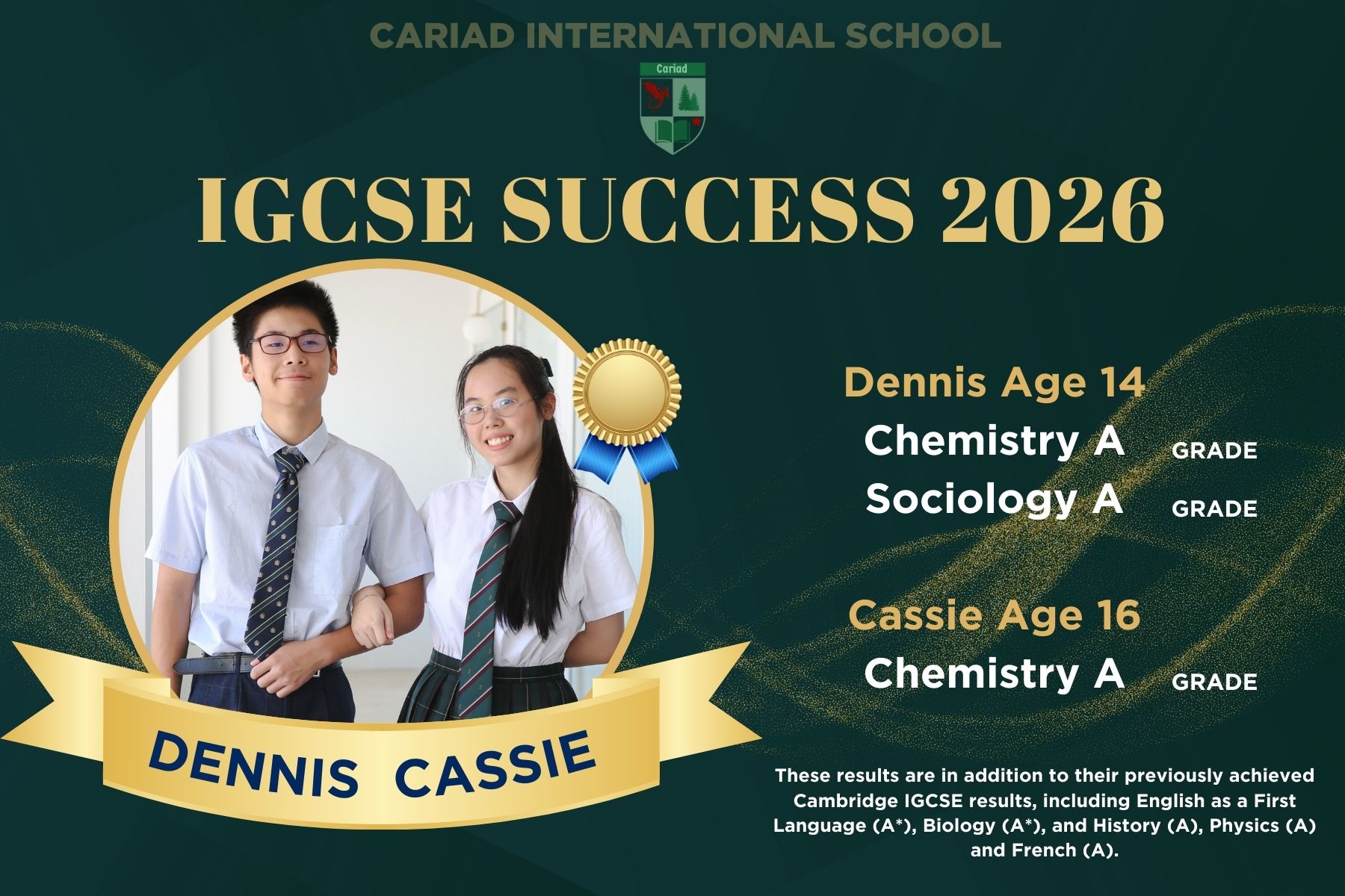 Warm congratulations to our students on their excellent performance in the Cambridge IGCSE Examinations: Cassie , Grade A in Chemistry,Dennis , Grade A in Chemistry and Sociology.