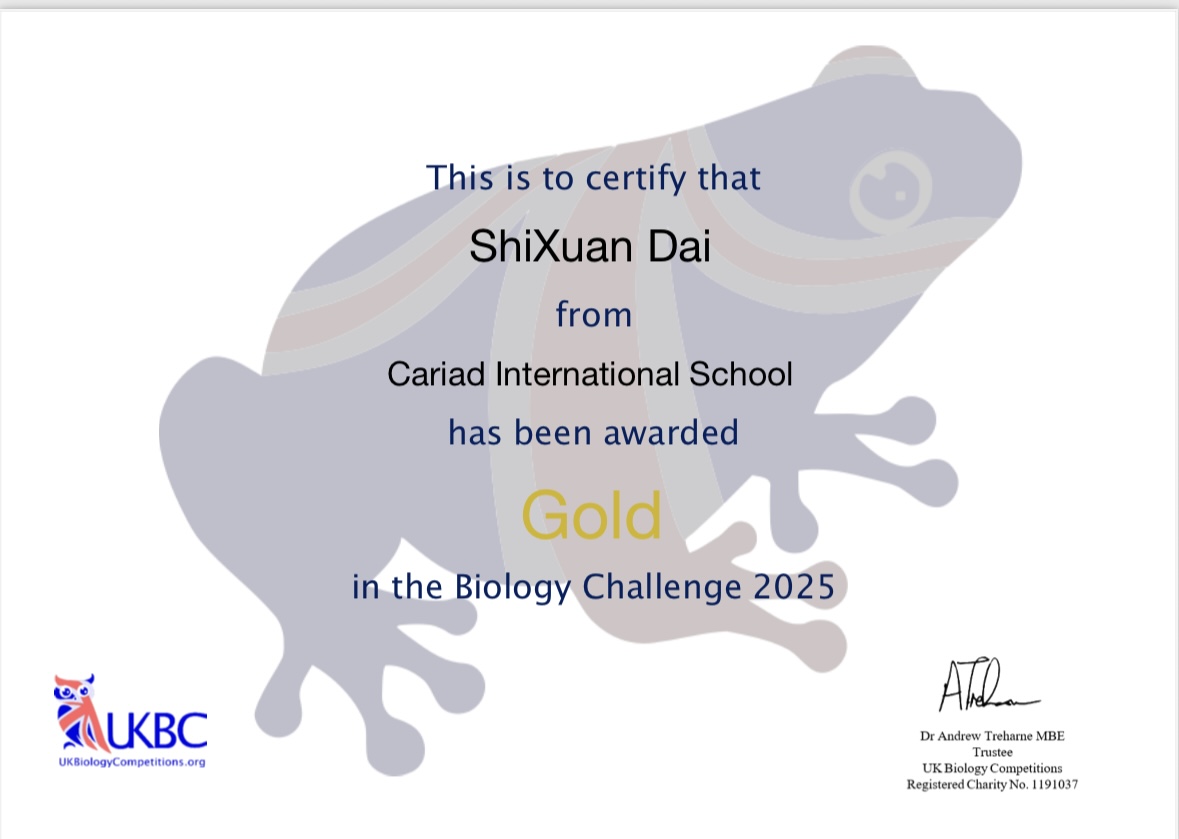 2025/06/03Big congrats to Dennis for winning the Gold Award in the UK Biology Challenge(UKBC)! Representing Cariad, he made us all so proud with this amazing achievement.